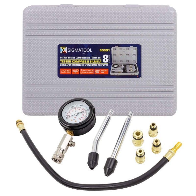 Набор с индикатором компрессии бензинового двигателя из 8 предметов в кейсе. Является профессиональным инструментом для определения давления в цилиндрах бензинового двигателя. Он состоит из манометров с диапазоном измерения 0-20 bar и точностью ±0.25 bar, жёстких прижимных адаптеров и адаптеров с различными резьбовыми соединениями (М10х1.0, М12х1.25, М14х1.25, М18х1.5). Благодаря такому набору, можно быстро и удобно измерить давление в любом бензиновом двигателе. Все инструменты находятся в прочном кейсе, что обеспечивает удобство хранения и транспортировки набора.
