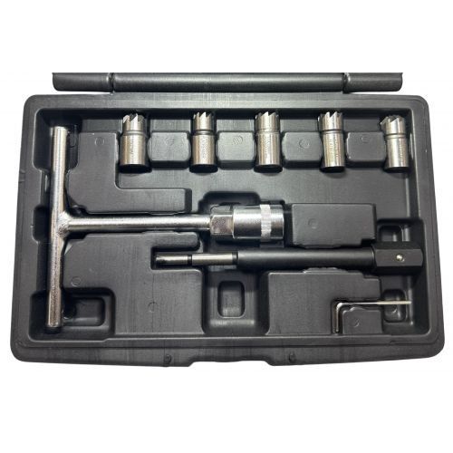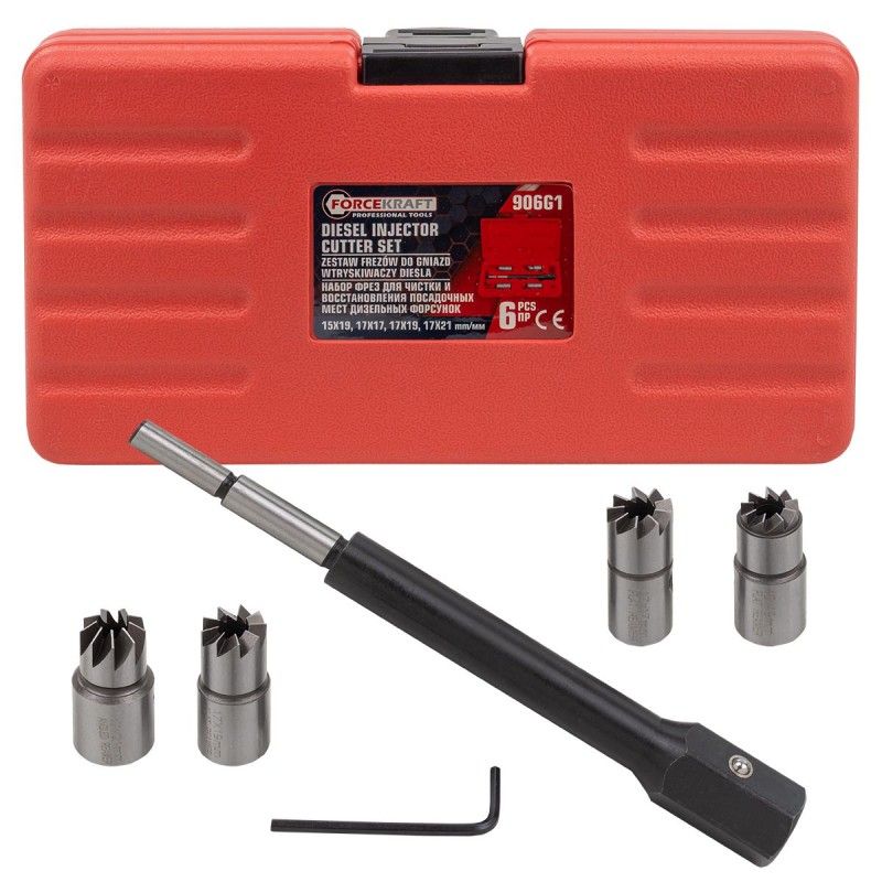 Набор фрез для чистки и восстановления посадочных мест дизельных форсунок 17 предметов в кейсе предназначен для очистки и притирки седел форсунок для дизельных двигателей с системой впрыска Сommon Rail. Применяется для притирки седел форсунок дизельного двигателя для плотного прилегания новых форсунок. Притирка снижает риск "прорыва газа", который возникает из-за накопления нагара под форсункой, а также помогает избежать дальнейшей коррозии металла. Применяется для всех современных дизельных двигателей типа common rail. В результате использования инструмента производится очистка седла форсунки от нагара, сглаживаются микронеровности, и обеспечивается герметичная посадка форсунки. Данный набор износостойкий и предназначен для профессионального ежедневного использования.