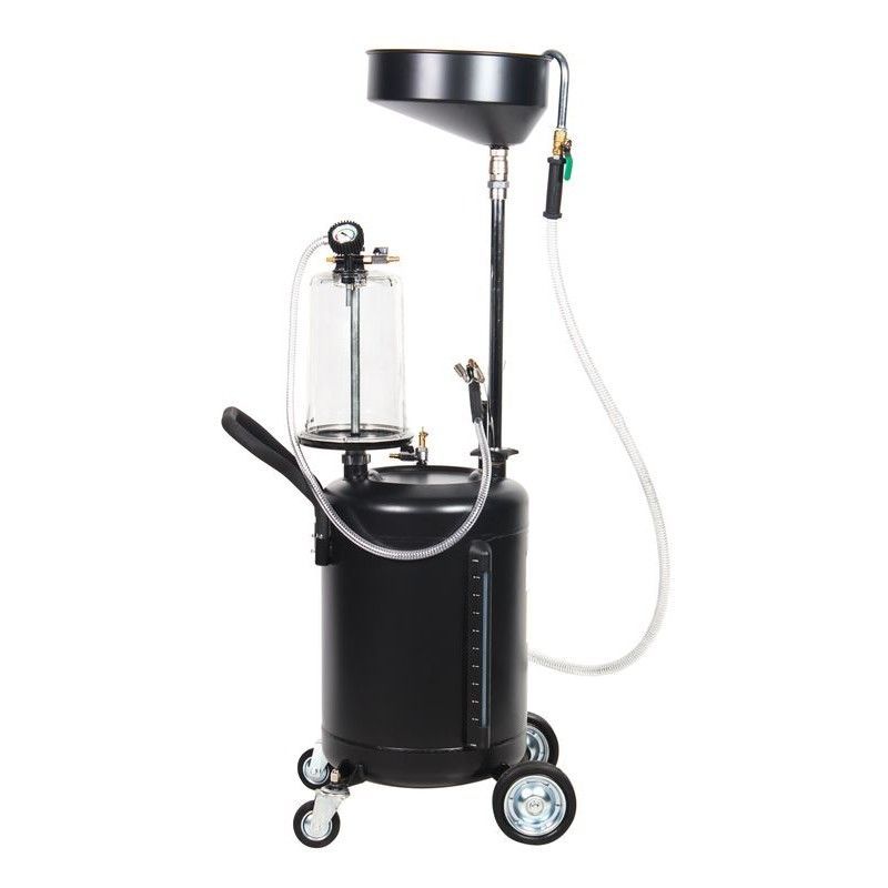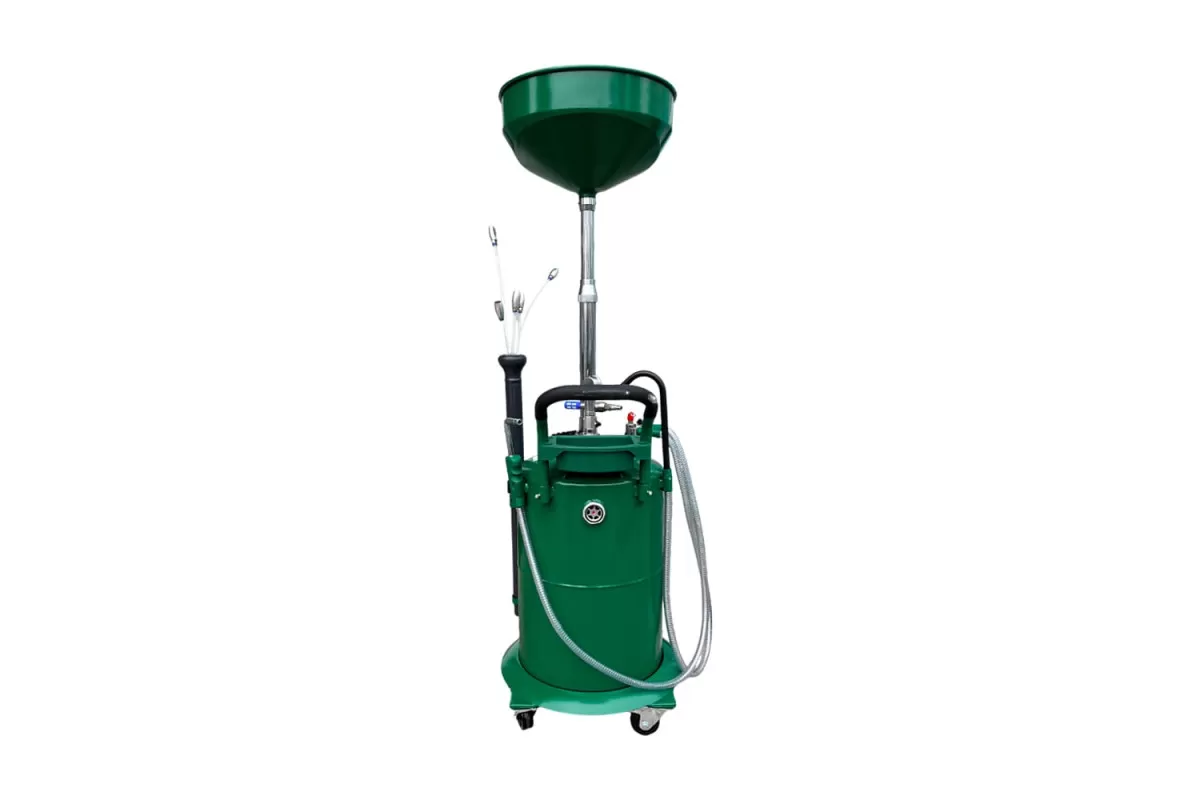 Пневматическая установка для сбора масла 90 л серая предназначена для удаления отработанного масла и других жидкостей из любого транспортного средства при помощи вентури-вакуумной вытяжной системы или свободным сливом. Используется как сливное устройство со свободным сливом отработанного масла из двигателей, коробок передач и дифференциалов всех транспортных средств. Установка портативна и проста в эксплуатации. Включает 5 гибких щупов для извлечения жидкости через отверстие щупа контроля уровня масла автомобиля. Регулируемая воронка для сбора масла может быть установлена на необходимой для работы высоте. Оборудование укомплектовано краном в воронке для сбора масла, для контроля состояния сливаемого масла перед началом слива в резервуар. Возможность самоочистки делает работу с устройством чистой и легкой. Осмотровая колба позволяет визуально оценить качество отработанного масла, имеющиеся недостатки двигателя и т.п.